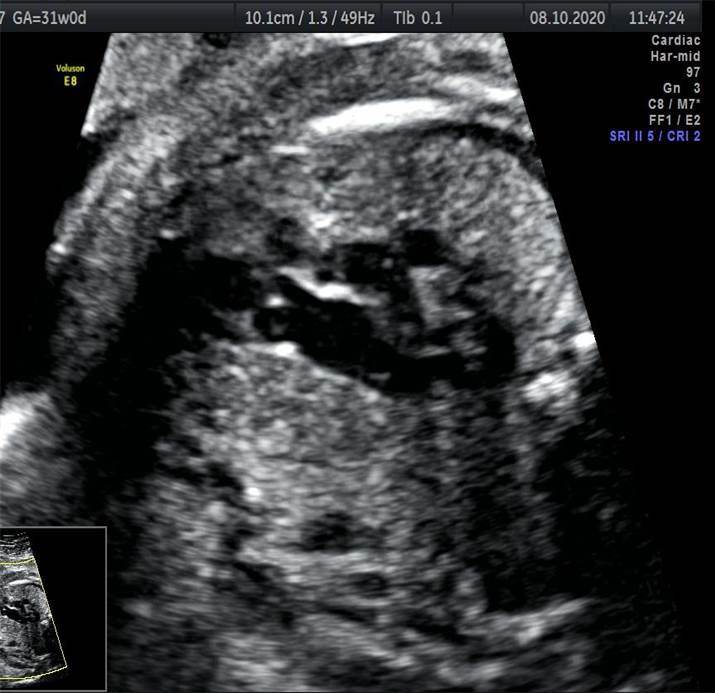 Проанализируйте изображения и видеоклипы грудной клетки плода в 31 неделю, установите диагноз и дальнейшую тактику ведения беременности