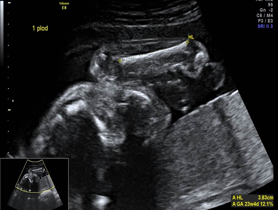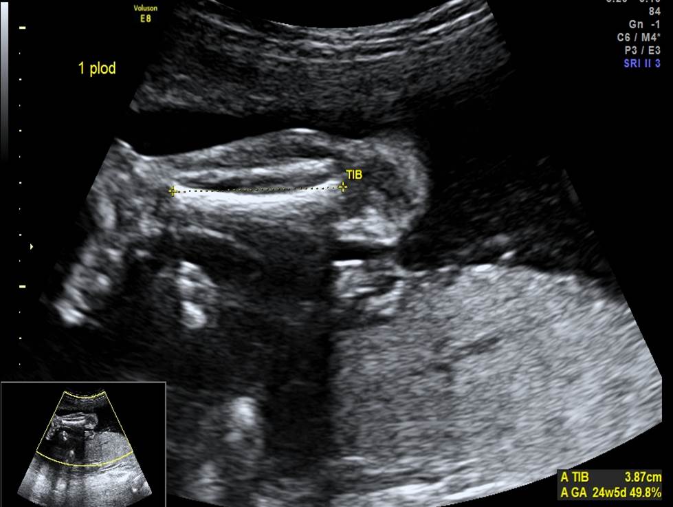 Проанализируйте изображения первого плода из дихориальной двойни в 24 недели (плод мужского пола), установите диагноз и дальнейшую тактику ведения беременности