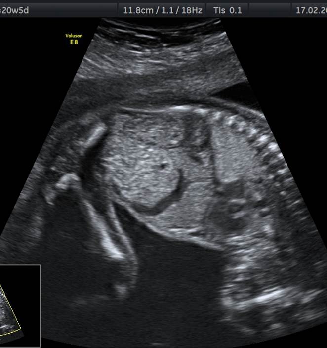 Интересно, что у этого плода УЗ-картина во втором триместре была недостаточно выраженная для постановки данного диагноза. Создавалось впечатление скорее о формирующейся обструкции оттока мочи от этой почки, однако размер почечной лоханки был в пределах нормы, что не позволяло поставить диагноз пиелоэктазии. Паренхима этой почки была более эхогенной по сравнению с противоположной почкой, однако четкого диагноза на этом основании поставить было нельзя